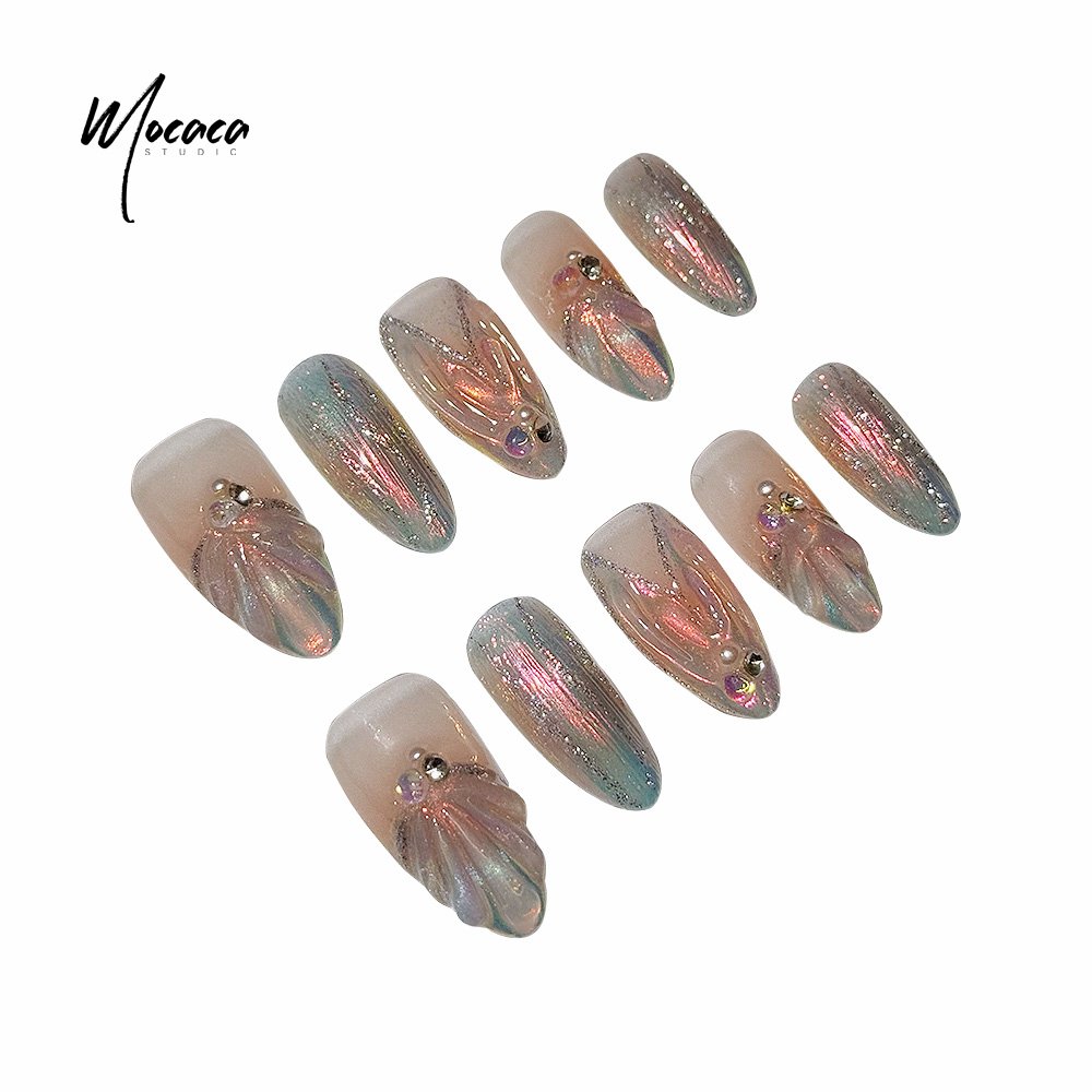 May 16, 2025「MOCACA」Mermaid Princess Press-On Nails – Iridescent Pink & Crystal Almond Shape | Medium Length False Nails